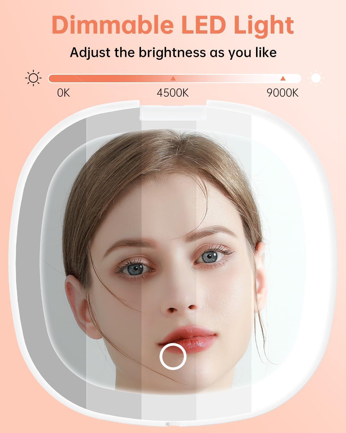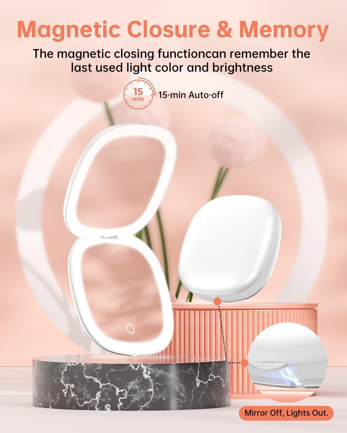 【Magnetic Enclosure & Ingenious Retention】Our travel mirror entails a practical magnetic enclosure, which guarantees storage that is both safe and effortless. Additionally, it flaunts an ingenious retention function that preserves your favored light color and brightness configurations. When reactivated, it will delicately restore the previous settings, endowing you with a flawless and uninterrupted experience every single time