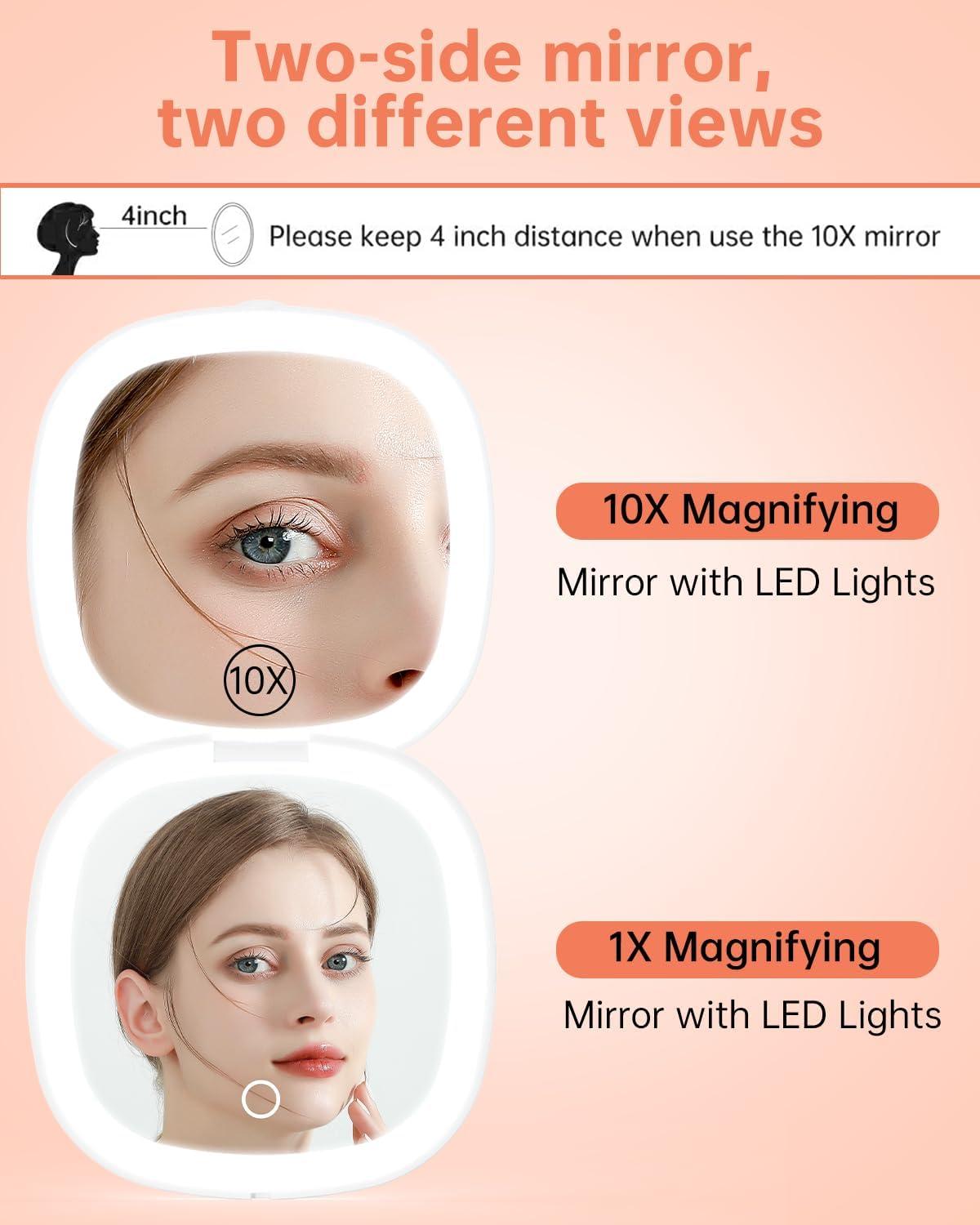 Gospire 3.9" Rechargeable Travel Makeup Mirror with Lights and Magnification 10X, 3 Light Colors & Adjustable Brightness, Magnetic Closure & Memory Function, LED Compact Mirror for Purse - Light Pink(White)