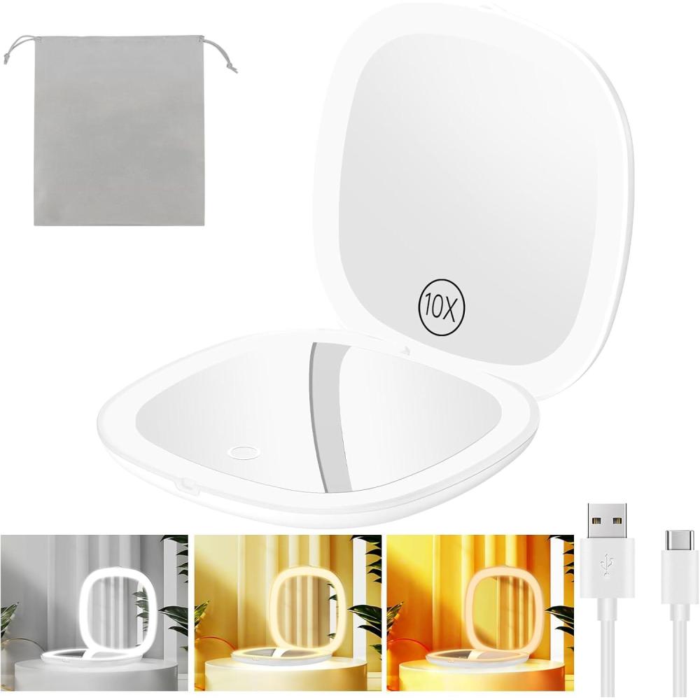 Gospire 3.9″ Rechargeable Travel Makeup Mirror with Lights and Magnification 10X, 3 Light Colors & Adjustable Brightness, Magnetic Closure & Memory Function, LED Compact Mirror for Purse – Light Pink(White)