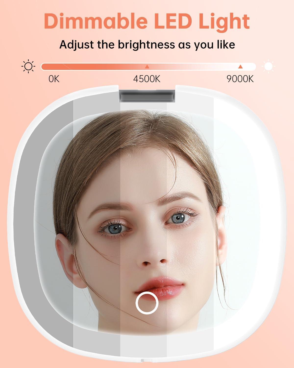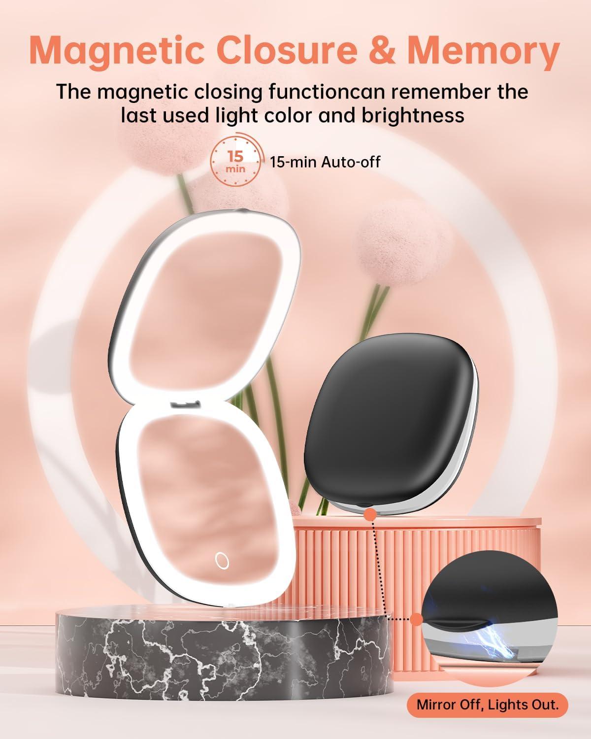 【Magnetic Enclosure & Ingenious Retention】Our travel mirror entails a practical magnetic enclosure, which guarantees storage that is both safe and effortless. Additionally, it flaunts an ingenious retention function that preserves your favored light color and brightness configurations. When reactivated, it will delicately restore the previous settings, endowing you with a flawless and uninterrupted experience every single time