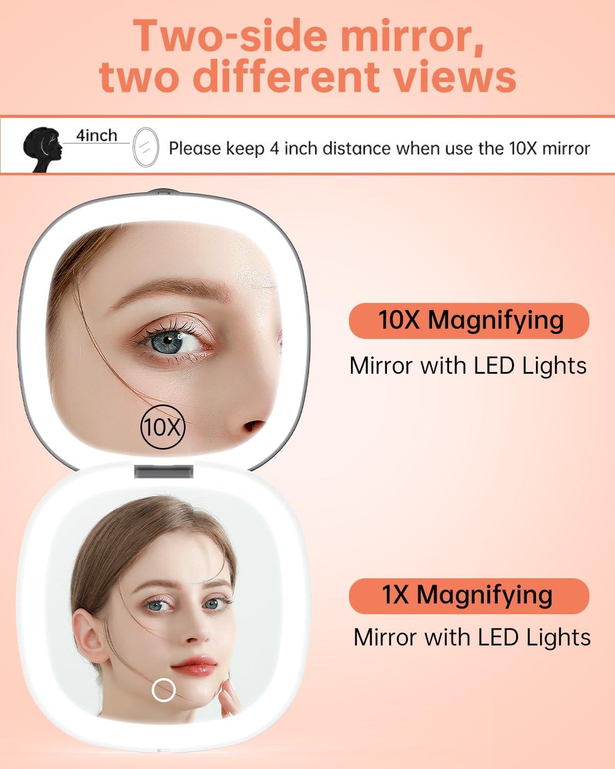 Gospire 3.9″ Rechargeable Travel Makeup Mirror with Lights and Magnification 10X, 3 Light Colors & Adjustable Brightness, Magnetic Closure & Memory Function, LED Compact Mirror for Purse – Light Pink(Light Pink)
