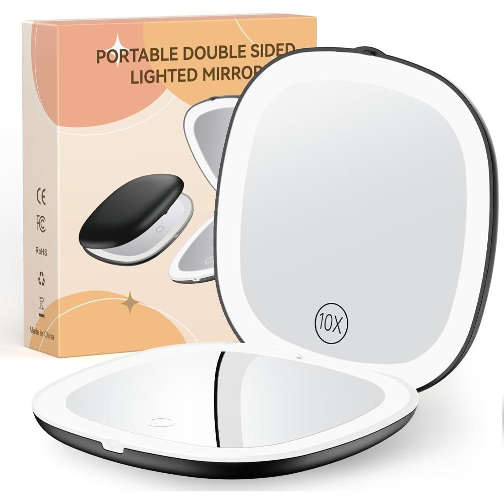 Gospire 3.9″ Rechargeable Travel Makeup Mirror with Lights and Magnification 10X, 3 Light Colors & Adjustable Brightness, Magnetic Closure & Memory Function, LED Compact Mirror for Purse – Light Pink(Black)