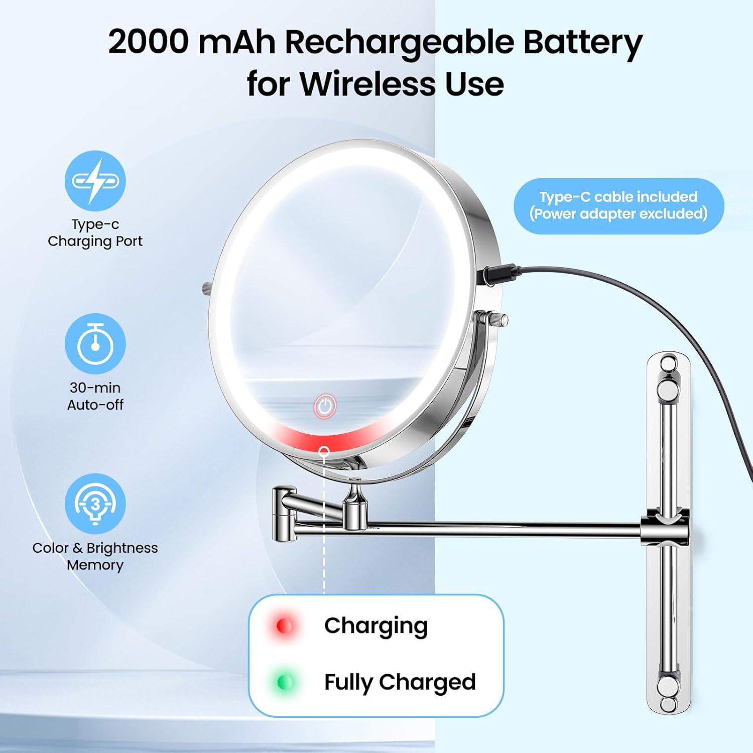 【2000 mAh Rechargeable Battery & Wireless Use】Enjoy the freedom of a cordless mirror with wireless and rechargeable design. With a powerful 2000 mAh battery, you can effortlessly use your mirror on-the-go for up to several weeks on a single charge. Enjoy the ultimate convenience of using your mirror anywhere, at any time – no cords, no hassle.