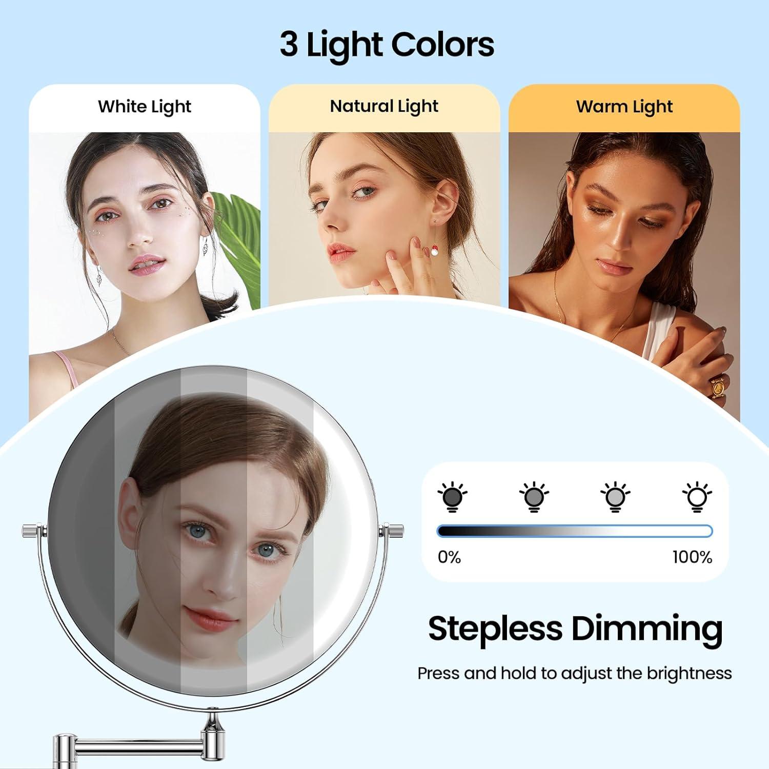 【3 Light Colors & Adjustable Brightness】Short touch the switch to change between White Light, Natural Light and Warm Light. Long press the switch to adjust brightness. (Please prioritize trying to adjust the brightness as shown in the video to adjust the light to the brightest if you feel the light is too dim after receiving the mirror)