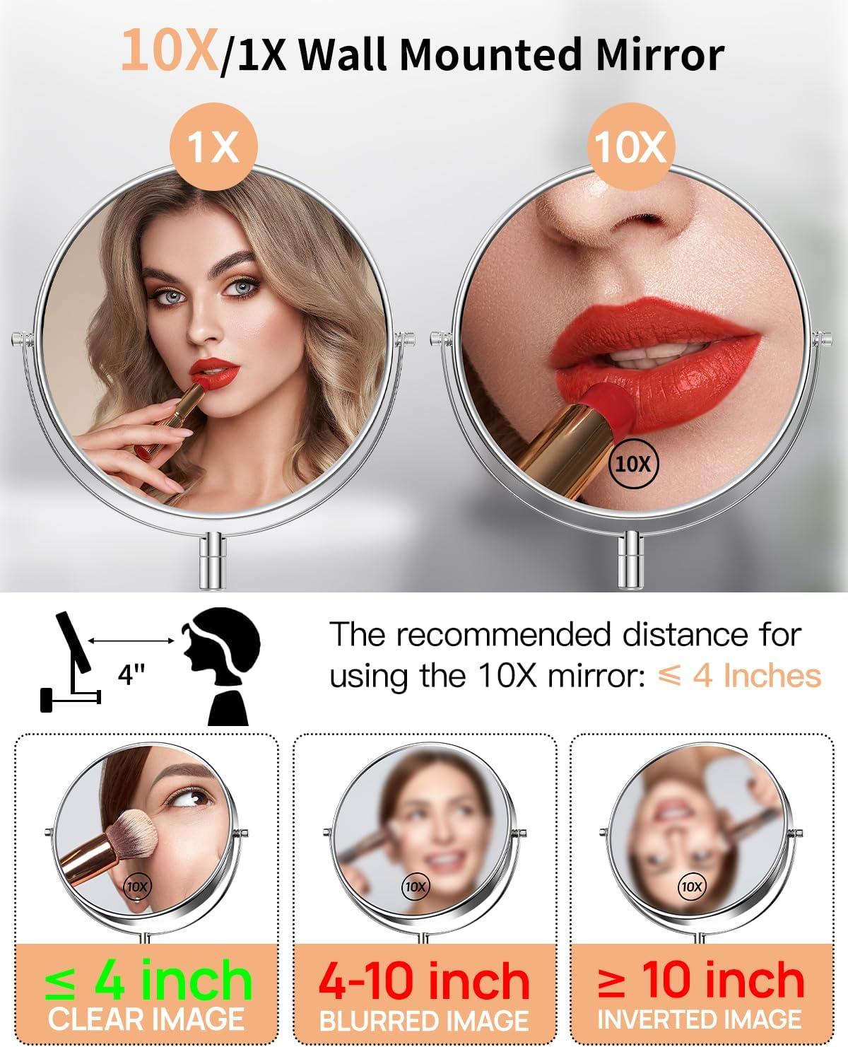 [10X/1X Dual-Sided MAGNIFICATION] : This wall-mounted mirror is double-sided design, the 1X side is designed for overall look. The 10X magnification side is suitable for detailed makeup, shave, comb your hair, etc. (The magnifying side uses a short-focus convex lens. For a clear, enlarged view of facial details, hold them within 4 inches. )