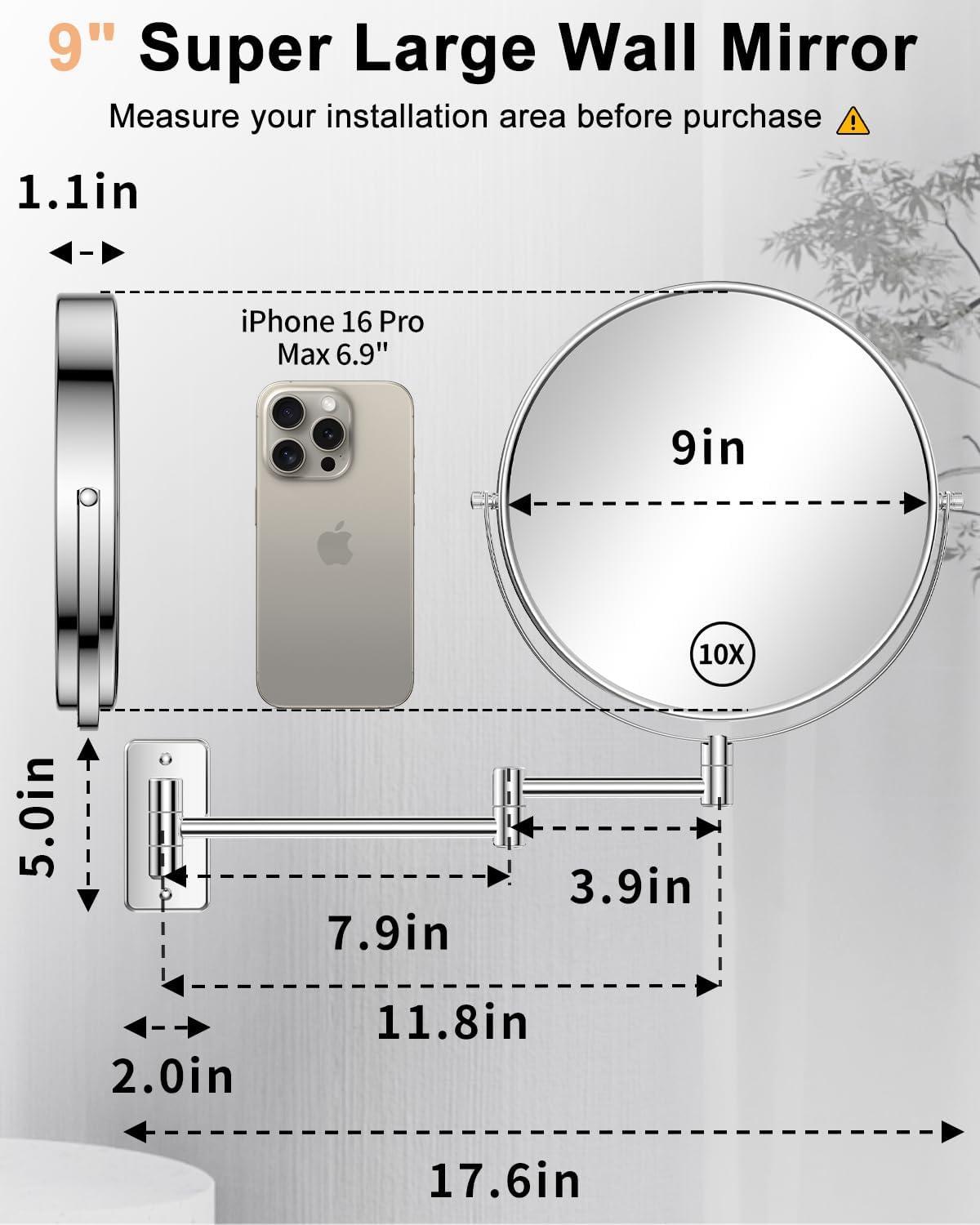 [Verify Your Wall Space] This 9-inch mirror extends up to 17.6 inches and requires ample space to use. Measure before purchase to ensure proper fit