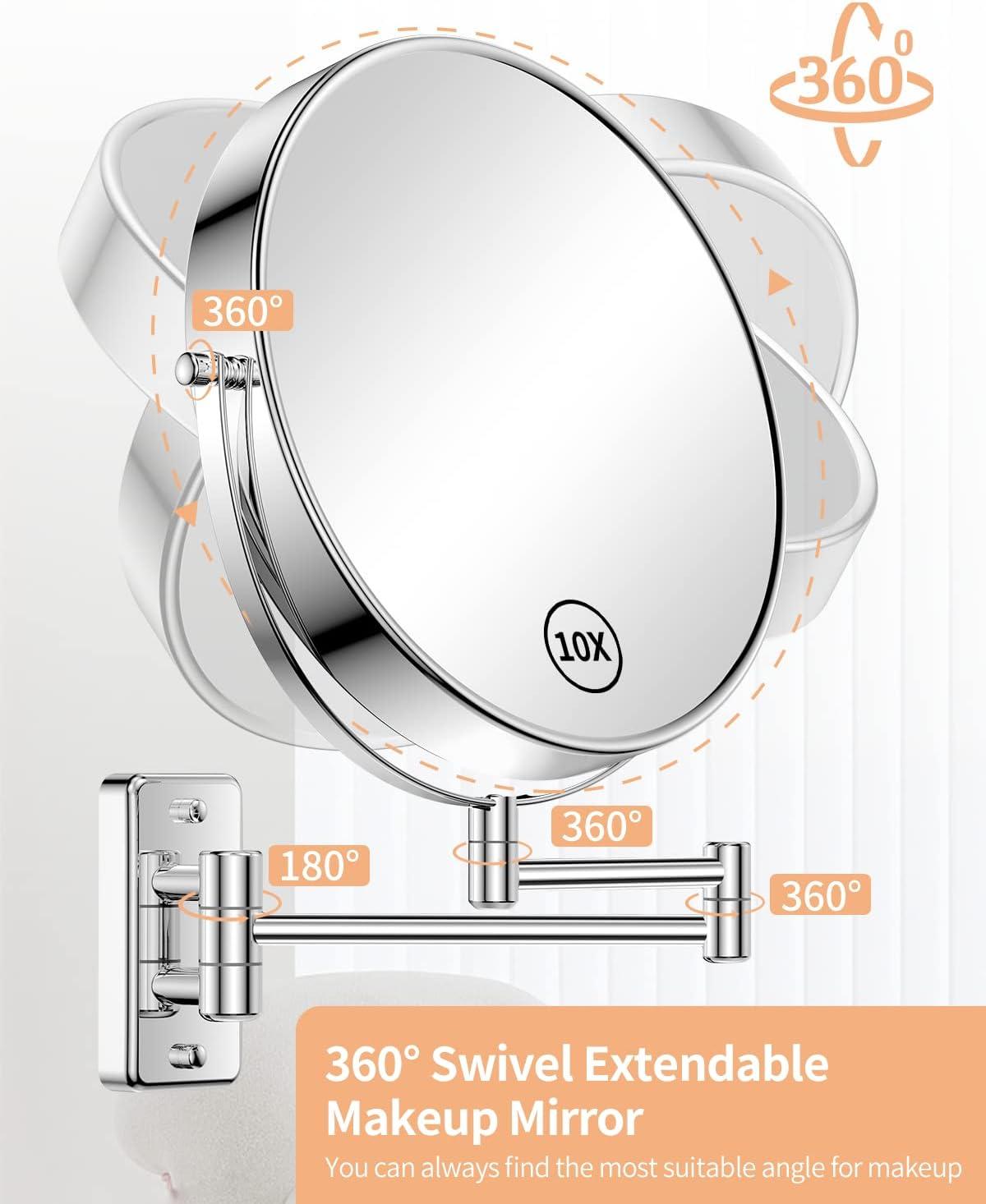 [180°& 360°SWIVEL EXTENDABLE MIRROR] : The makeup mirror face can be rotated 360 degrees. It can be rotated 180 degrees within the frame and 360 degrees on both extending arms. You can adjust the mirror to any angle and position you need. When not in use, it can also be folded up to save space