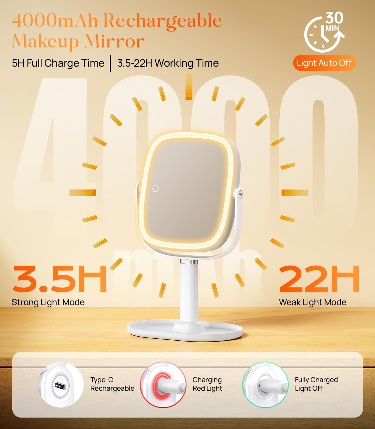【4000mAh Rechargeable Battery】This makeup vanity mirror with lights comes with a powerful 4000mAh lithium battery, giving you 3.5 to 22 hours of glow on just a 5-hour charge, depending on how bright you like it. Say goodbye to constant charging—it’s designed to keep up with your routine effortlessly