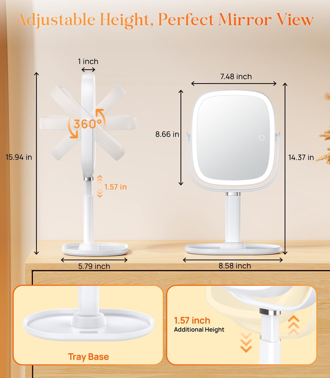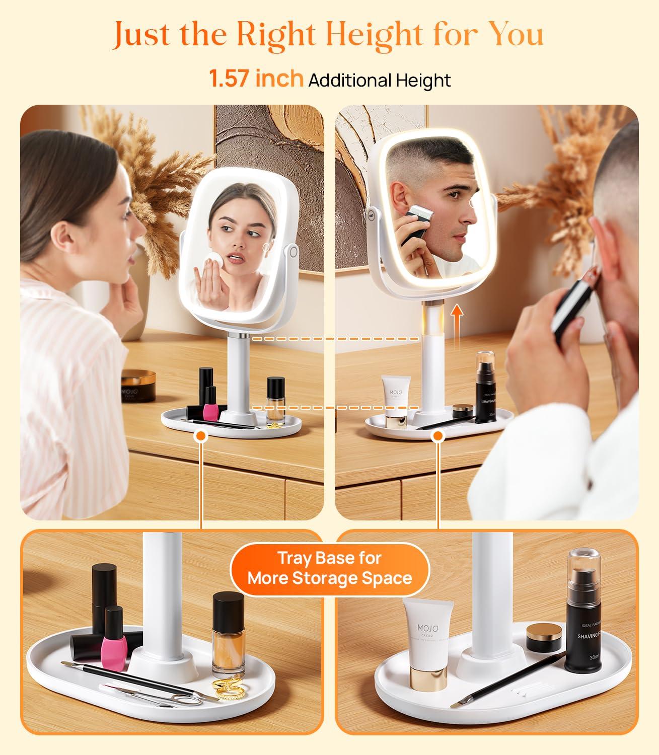 【Adjustable Height & 1.57in Telescopic Range】This make up mirror with lighting holder features a 1.57in height adjustment, allowing you to customize the mirror’s position from 14.37in to 15.94in. Perfect for makeup, skincare, shaving, and more—it adapts to your needs effortlessly