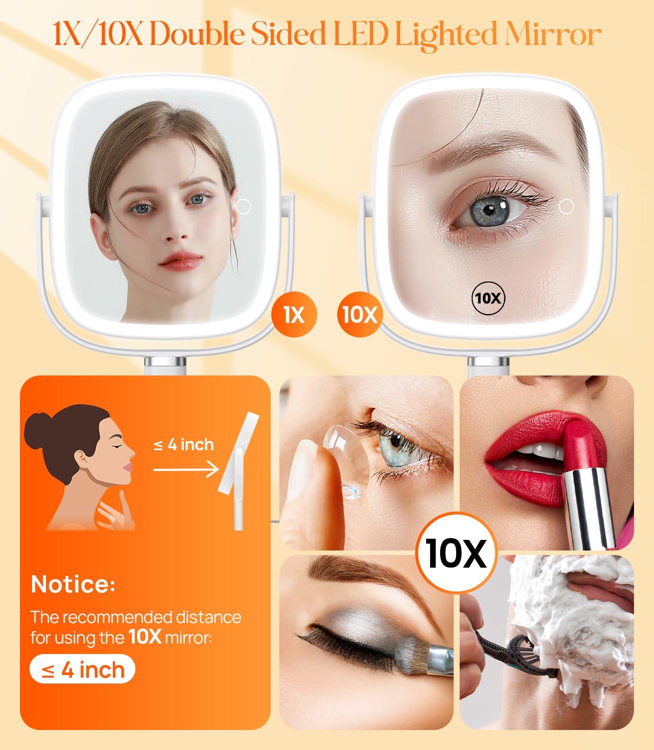 【1X & 10X Magnification】This magnifying mirror with light has a 1X HD side perfect for your everyday makeup and hairstyling, and a 10X magnifying side that’s ideal for those detailed moments—whether it’s skincare, precise makeup, or a close shave