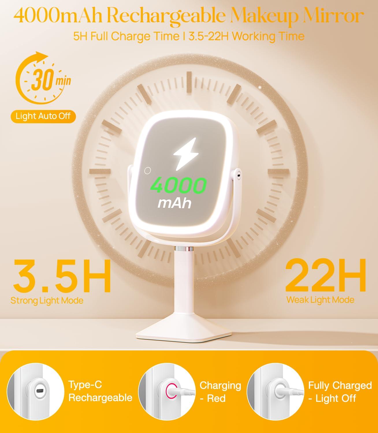 【4000mAh Rechargeable Battery】This makeup vanity mirror with lights comes with a powerful 4000mAh lithium battery, giving you 3.5 to 22 hours of glow on just a 5-hour charge, depending on how bright you like it. Say goodbye to constant charging—it’s designed to keep up with your routine effortlessly