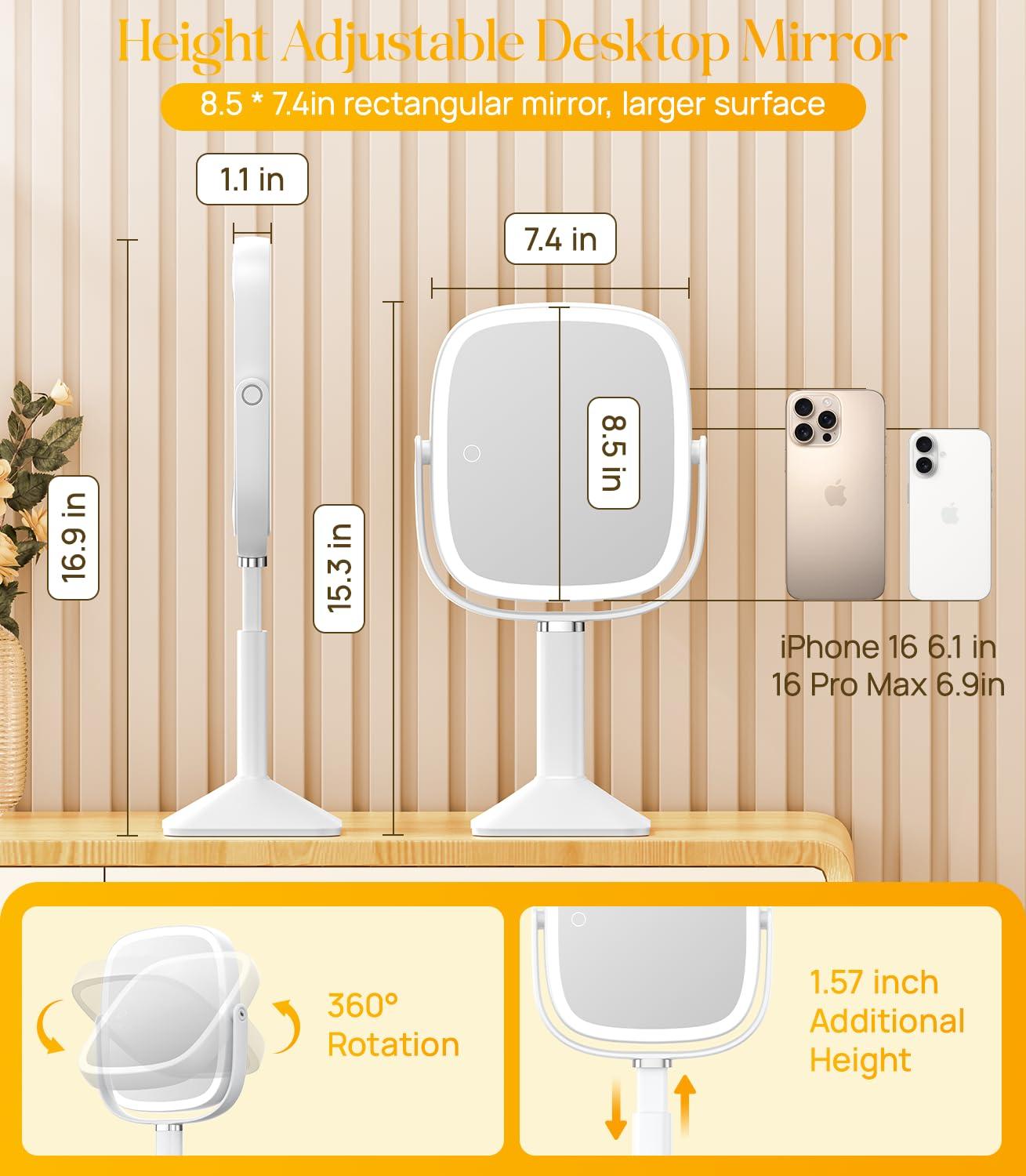 【Adjustable Height & 1.57in Telescopic Range】This make up mirror with lighting holder features a 1.57in height adjustment, allowing you to customize the mirror’s position from 14.37in to 15.94in. Perfect for makeup, skincare, shaving, and more—it adapts to your needs effortlessly