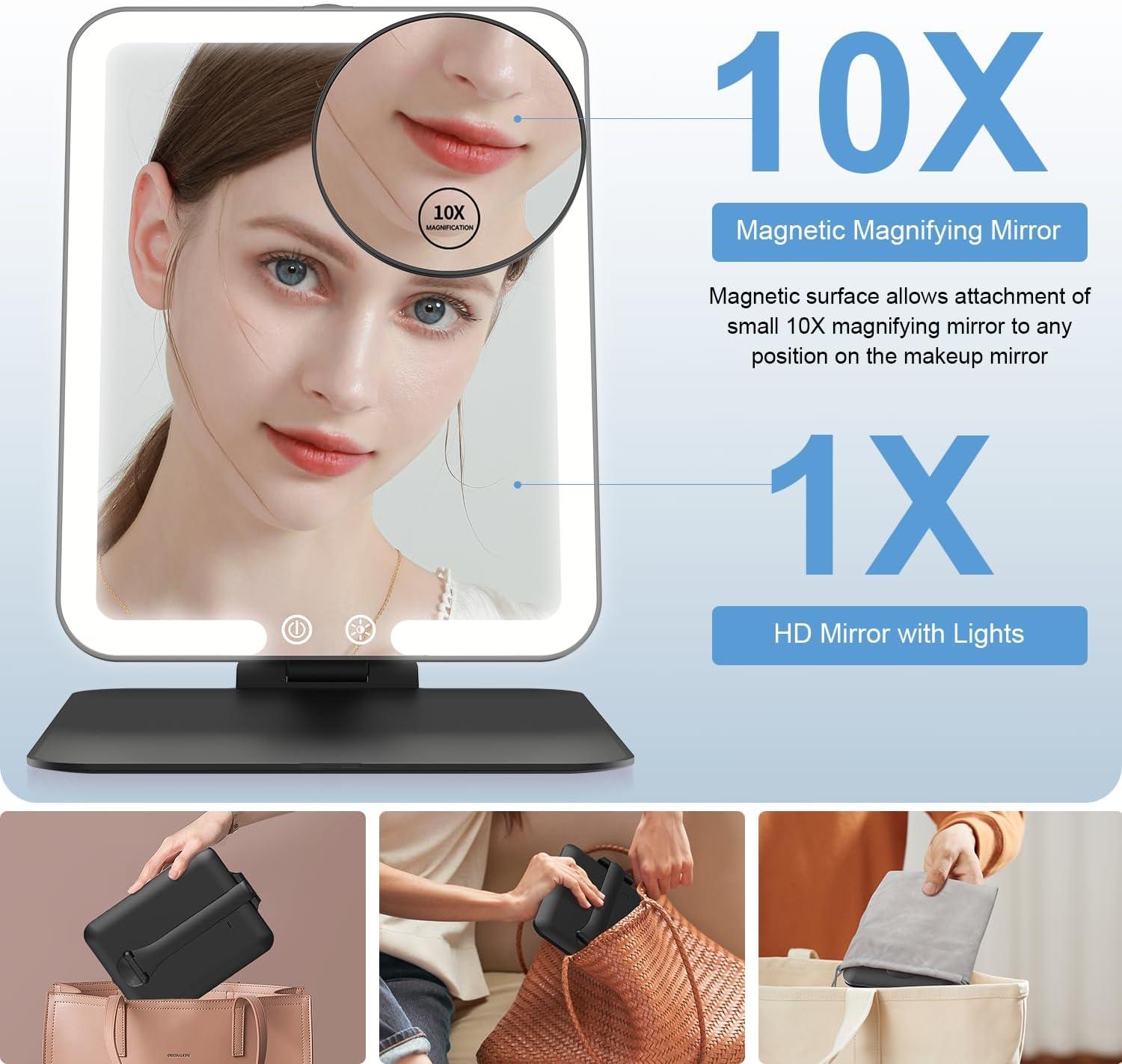 【1X/Detachable 10X Magnetic Magnifying Mirror】The 1X magnifying mirror is perfect for overall observation, while the 10X magnifying mirror makes tasks like applying mascara or inserting contact lenses precise and easy. The detachable 10X magnetic magnifying mirror can be used separately as a portable mirror for your convenience while out and about