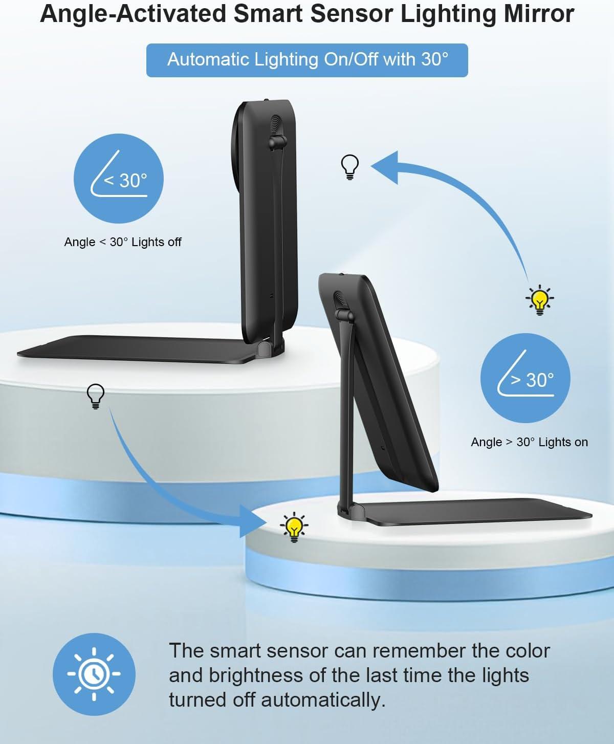 【180° Adjustable Smart Makeup Mirror】The desktop makeup mirror features a stand that can rotate and move 180° back and forth, allowing you to adjust to the perfect angle. Equipped with a smart sensing system, the mirror lights up when the stand is opened and automatically turns off when the mirror is closed, making it convenient and time-saving for you