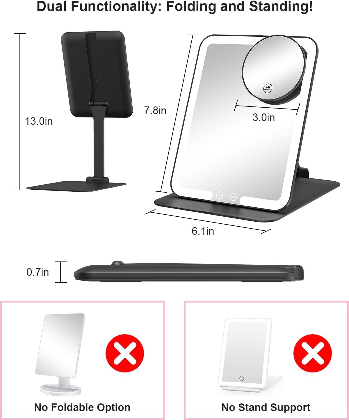 【Portable Travel Vanity Mirror】Dimensions: 6.1in*7.8in. Designed to be compact and foldable, the travel mirror with light comes with a velvet storage bag for easy carrying in luggage, handbags, and backpacks