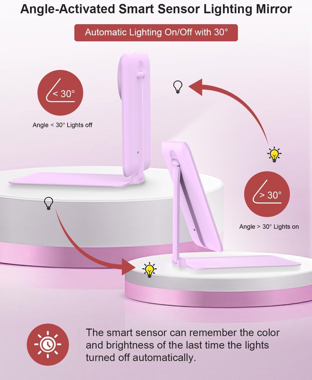 【180° Adjustable Smart Makeup Mirror】The desktop makeup mirror features a stand that can rotate and move 180° back and forth, allowing you to adjust to the perfect angle. Equipped with a smart sensing system, the mirror lights up when the stand is opened and automatically turns off when the mirror is closed, making it convenient and time-saving for you