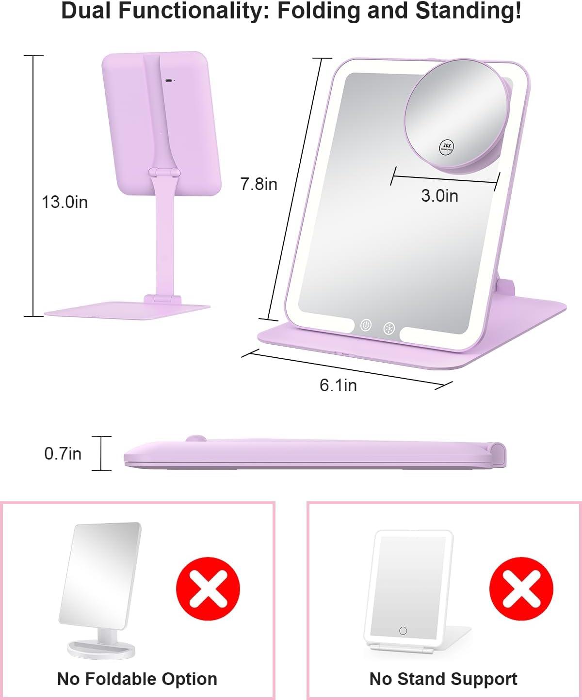 【Portable Travel Vanity Mirror】Dimensions: 6.1in*7.8in. Designed to be compact and foldable, the travel mirror with light comes with a velvet storage bag for easy carrying in luggage, handbags, and backpacks