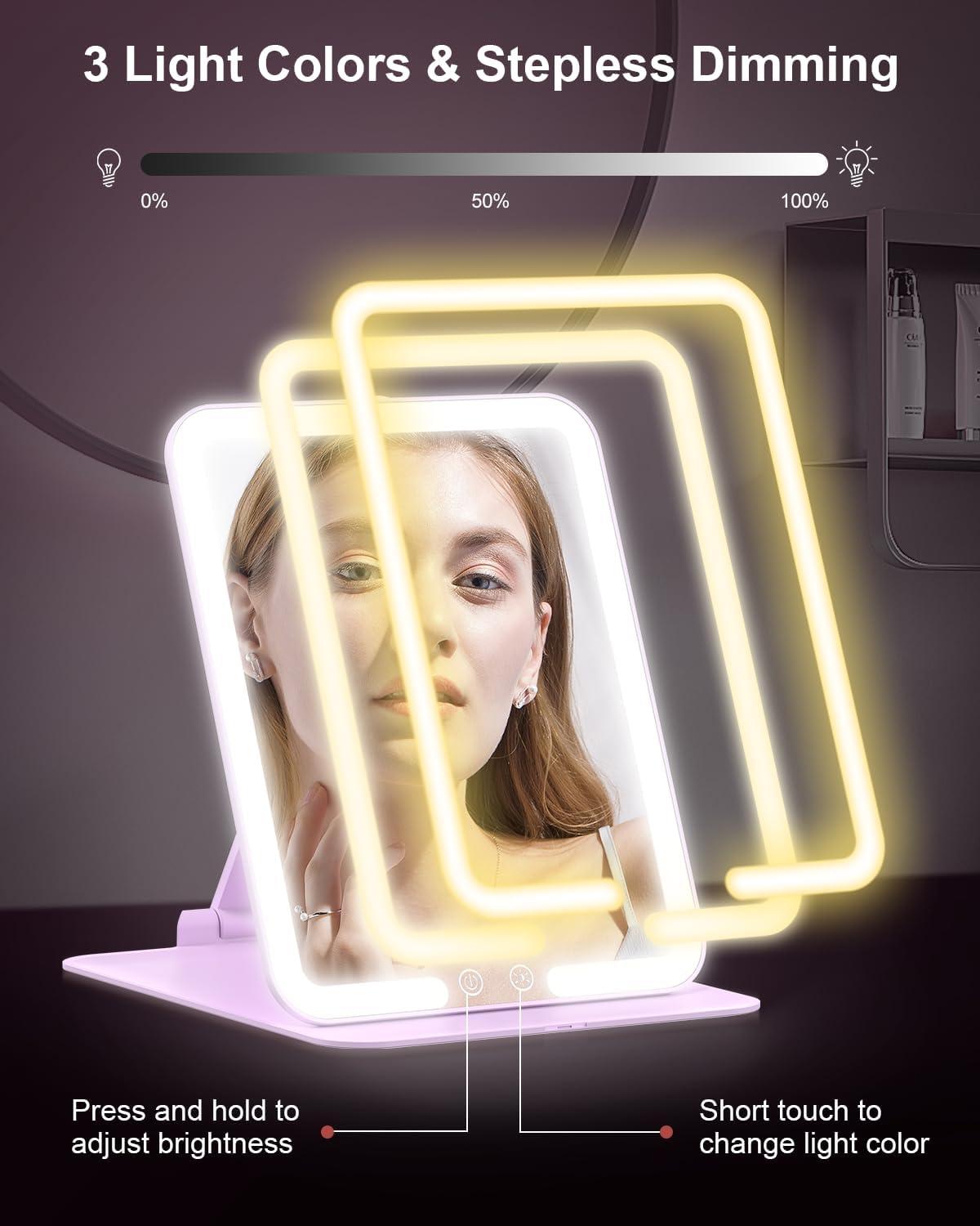 Gospire Travel Makeup Mirror with Lights and Magnification 10X, Portable Make Up Compact Tabletop Mirror with Adjustable Stand, 3 Colored Lights Rechargeable Lighted LED Vanity Mirror - Pink(Purple)